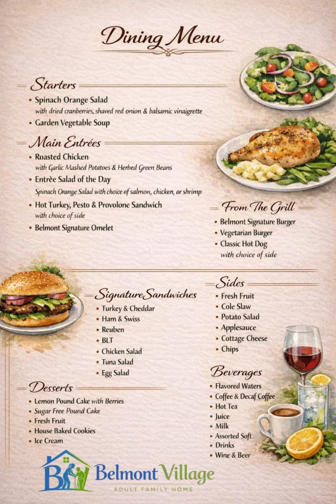 At Olympia Senior Care Services, dining is more than just a meal—it is a meaningful experience that brings residents, guests, and our community together. Each meal provides an opportunity for connection, comfort, and enjoyment in a warm and welcoming environment.
